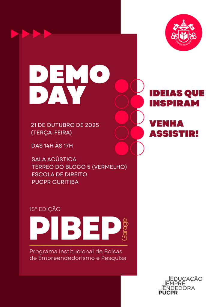 O Demoday marca o encerramento de mais uma edição do PIBEP (Programa Institucional de Bolsas em Empreendedorismo e Pesquisa) da PUCPR, realizado em parceria ao SEBRAE. Nesta ocasião, os cinco grupos finalistas do programa irão apresentar seus modelos de negócio a uma banca composta por protagonistas do ecossistema empreendedor.